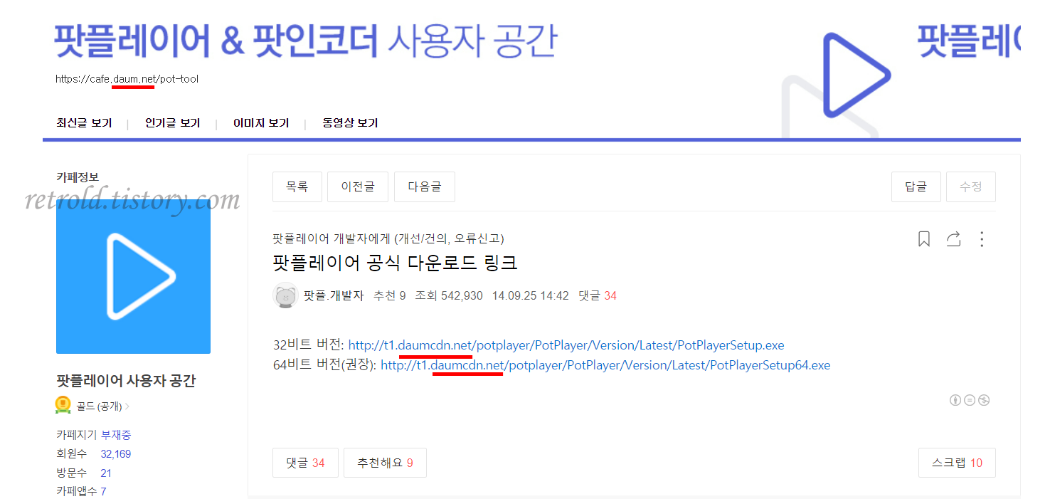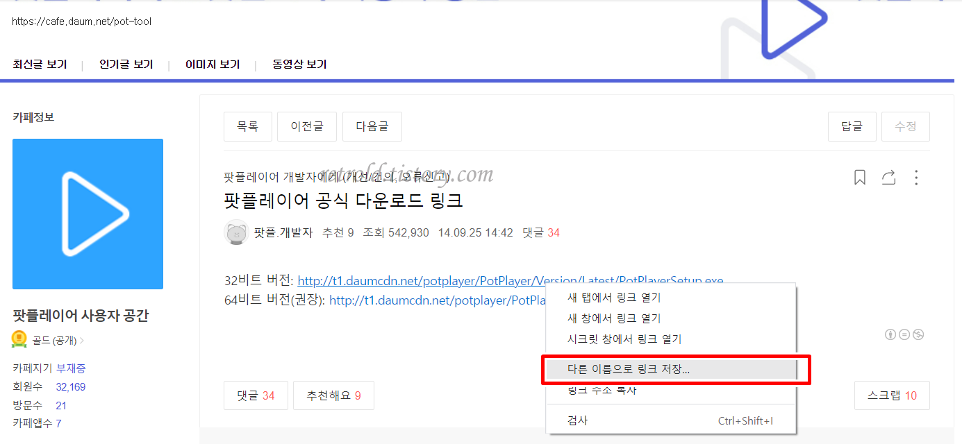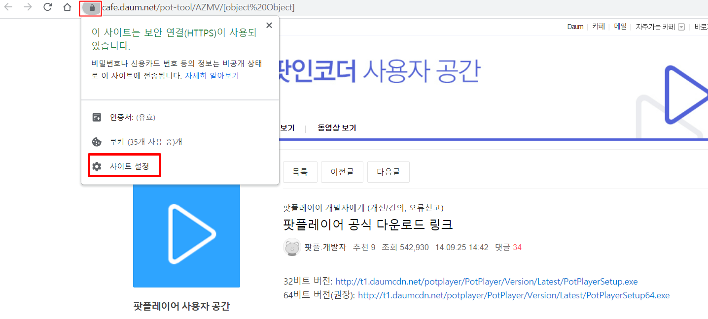 팟플레이어 공식 홈페이지 인데요. 해당 페이지는 daum.net 이지만 다운로드 링크는 daumcdn.net이라서 크롬 자체적으로 다운로드를 차단시킵니다.