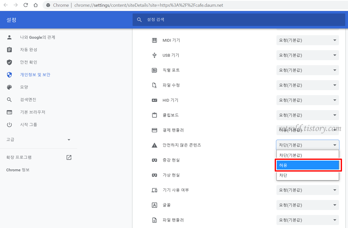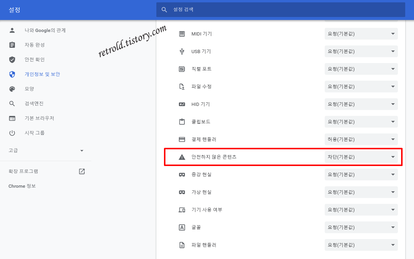 그 중 안전하지 않은 콘텐츠의 기본값이 '차단' 으로 설정되어 있는게 보입니다.