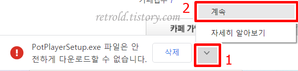 저장을 눌렀으면 크롬 브라우저 왼쪽 하단의 경고 창을 누른 후에 계속을 클릭합니다.
